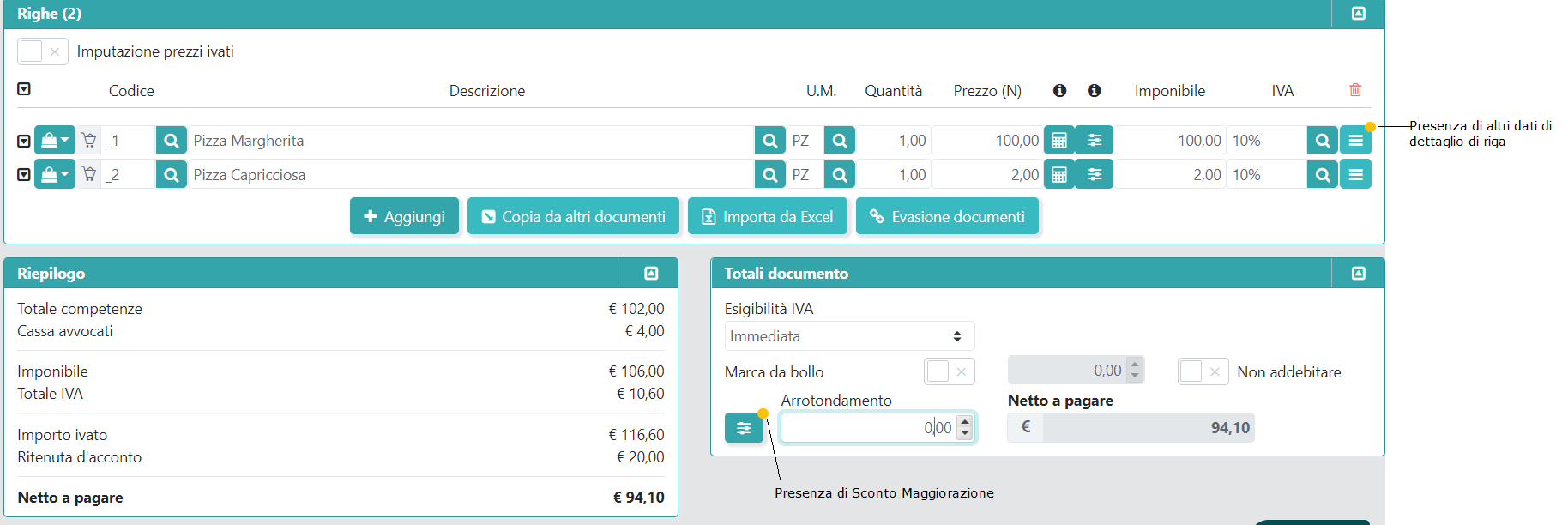4. Altri dati di riga e Sconto/Maggiorazione: messa in evidenza della loro presenza tramite puntino arancione sul pulsante