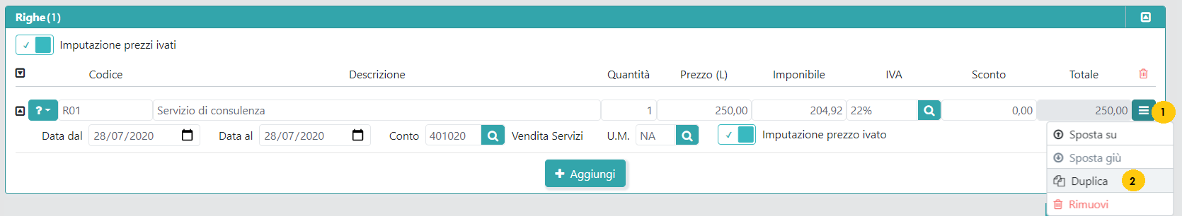 Nuova funzione Duplica per inserimento riga di dettaglio documento come copia di una riga esistente