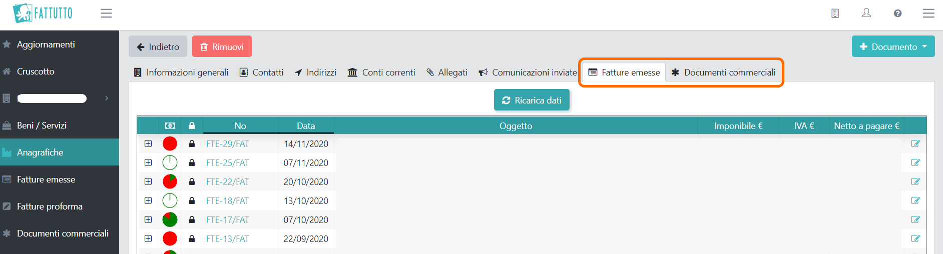 Abbiamo aggiunto due nuove sezioni Fatture emesse e Documenti commerciali nella pagina di dettaglio dell'Anagrafica,